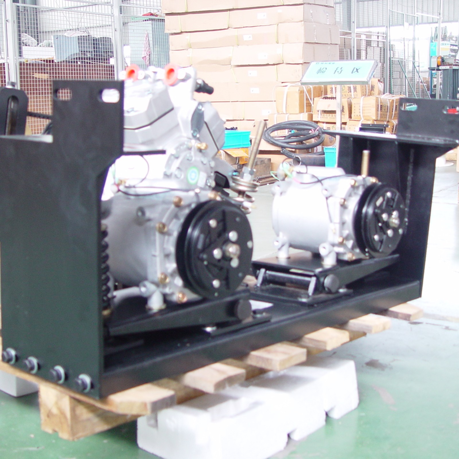 7.5米以上后置发动机客车,因空调系统制冷量大,需要配备的压缩机排量也更大,发动机无自带压缩机安装支架,需要在底盘大量上增设一个外挂压缩机安装支架,支架需具有安装简便、减震、传动带自涨紧、传动带过渡轮、六个自由度等功能。之前均为外购,采购周期长、成本高,响应速度慢